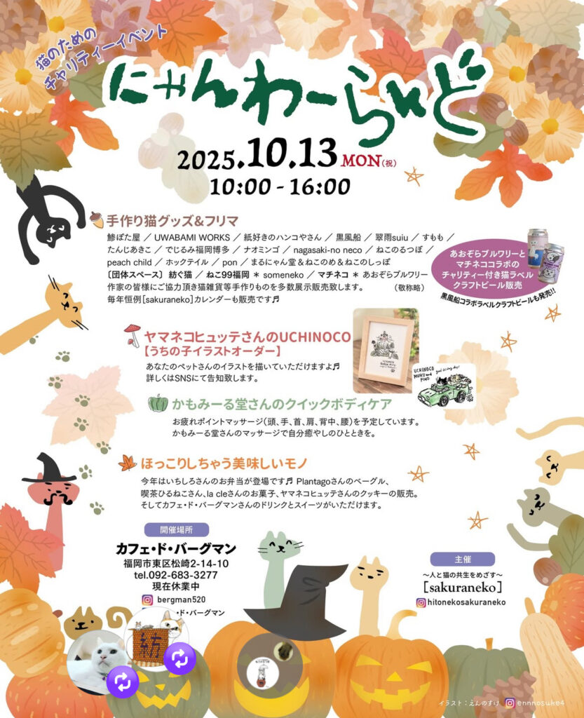 今年もにゃんわーらんど開催致します。 今年は10月13日(祝) です。 ねこ99福岡からも カレンダーや猫帽子、羊毛マスコットや somenekoさんの雑貨や かもみーる堂さんのマッサージ また、いろいろな手作り猫グッズやフリマ 開催予定です。 場所は 東区松崎2-14-10 カフェ・ド・バークマン ぜひ遊びに来てくださいね。
