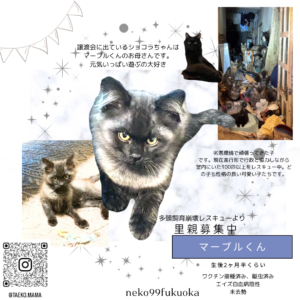 ○猫可住居にお住まいの方 頭数規定も併せてご確認下さい○完全室内飼い・脱走対策をしていただける方○ご家族皆様の同意を得られる方。 家族の一員として最後まで飼っていただける方。○単身者、未婚カップル、60歳以上の方にはご相談、または お断りをさせていただいております○毎年のワクチン接種をしていただける方○ご負担にならない程度で近況報告をいただける方○医療費の一部をご負担いただける方 (初期検査・ワクチン・等)の費用。※明細書、証明書があります)○譲渡誓約書への署名をご了承いただける方○せっかくつながった命です。大切な家族の一員として迎え入れてくださる飼い主さんを探しています。 写真や文章では伝わらない保護猫達の本当の姿をご覧になって、家族の一員に迎え入れていただけたらと思います。○引き渡し方法 希望者様宅にお連れし、家庭訪問等させていただきます。 お試し期間としてトライアルしていただいたのち、家族として迎えて良いと判断いただけましたら再訪させていただいて、譲渡契約書をかわさせていただきます。 お話がまとまった場合は、身分証の提示や誓約書の記載をお願いしております。 悪質な里親詐欺等がございますので、ご理解いただけると助かります。 この子達の他にも里親さんを募集したい子達がたくさんいます。 継続的な活動の為にも、医療費の一部をご負担ください。 動物病院から発行された領収書をお渡し致します。- この猫への連絡先(保護主)